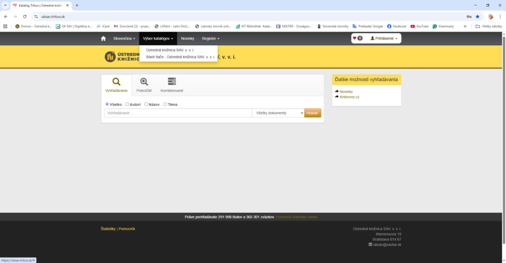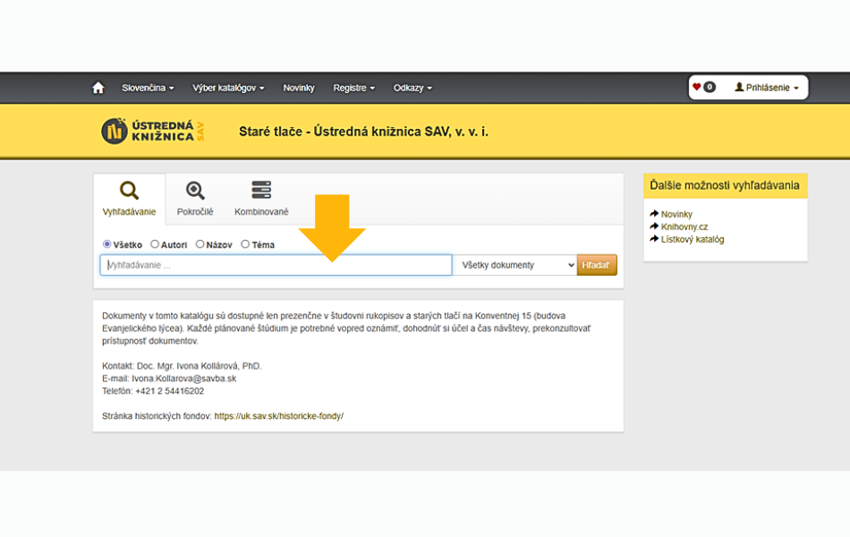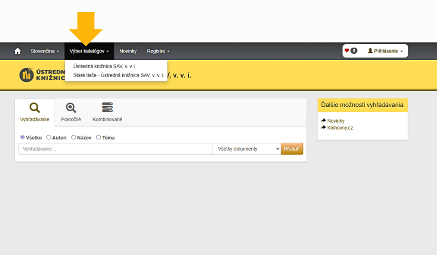 Katalóg starých tlačí je integrovaný do online katalógu Ústrednej knižnice SAV, v. v. i.. a vyhľadávanie len v nej vám zabezpečí výber v hornom riadku katalógu. Kliknite na výber katalógov a vyberte „Staré tlače“.
