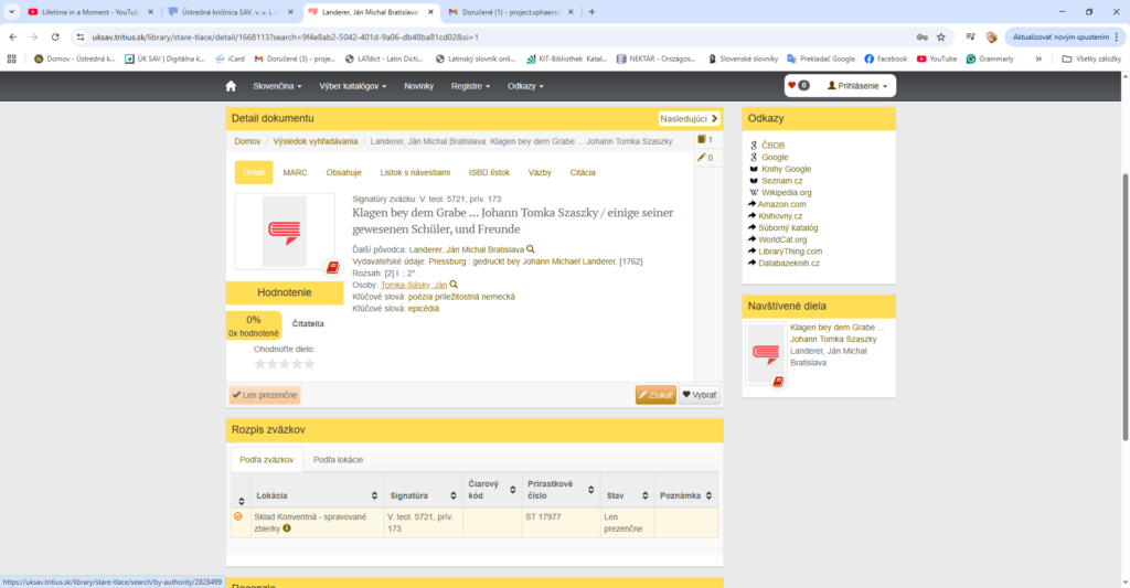 Na knihy s týmto statusom nie je možné zadať žiadanku. Ak si želáte sprístupniť dokument na prezenčné štúdium, opíšte údaje o dokumente (autor, skrátený názov, signatúra), prípadne využite vytvorenie vlastného zoznamu prostredníctvom voľby „Vybrať“). Žiadosť o návštevu študovne spolu so zoznamom požadovaných dokumentov pošlite na kontaktný e-mail študovne rukopisov a starých tlačí.