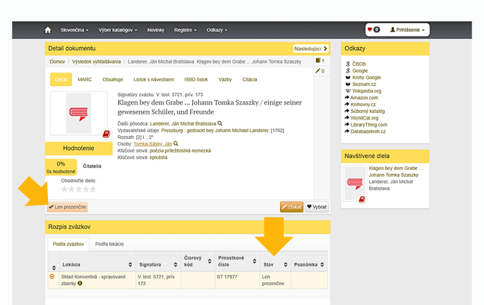 Pri vyhľadávaní dokumentov nájdete knihy alebo periodiká so statusom „Konventná …“ a so stavom dokumentu „Len prezenčne“.